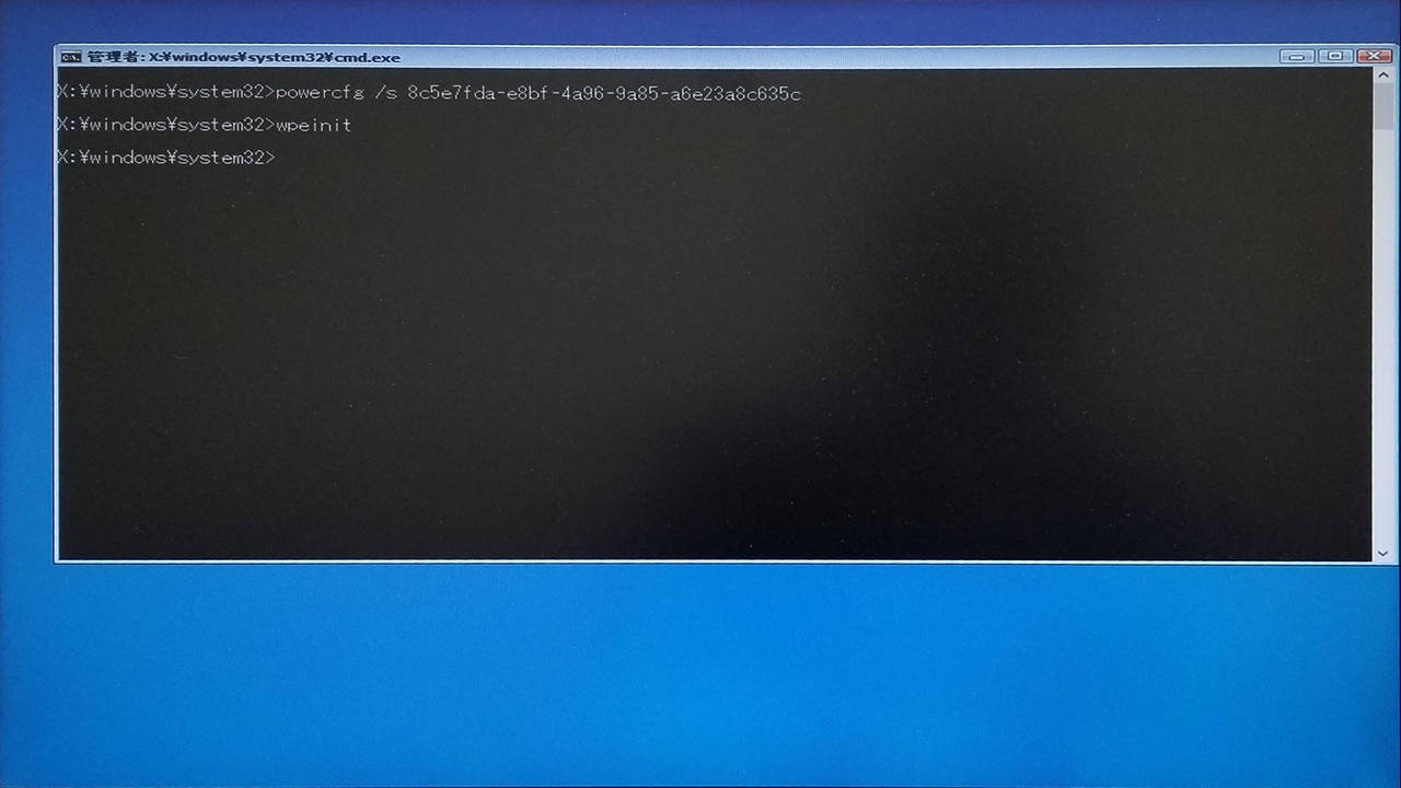 USB-B から Windows PE が起動して、次のようなプロンプトを表示して、ユーザーからの入力を待ち受ける状態になります。